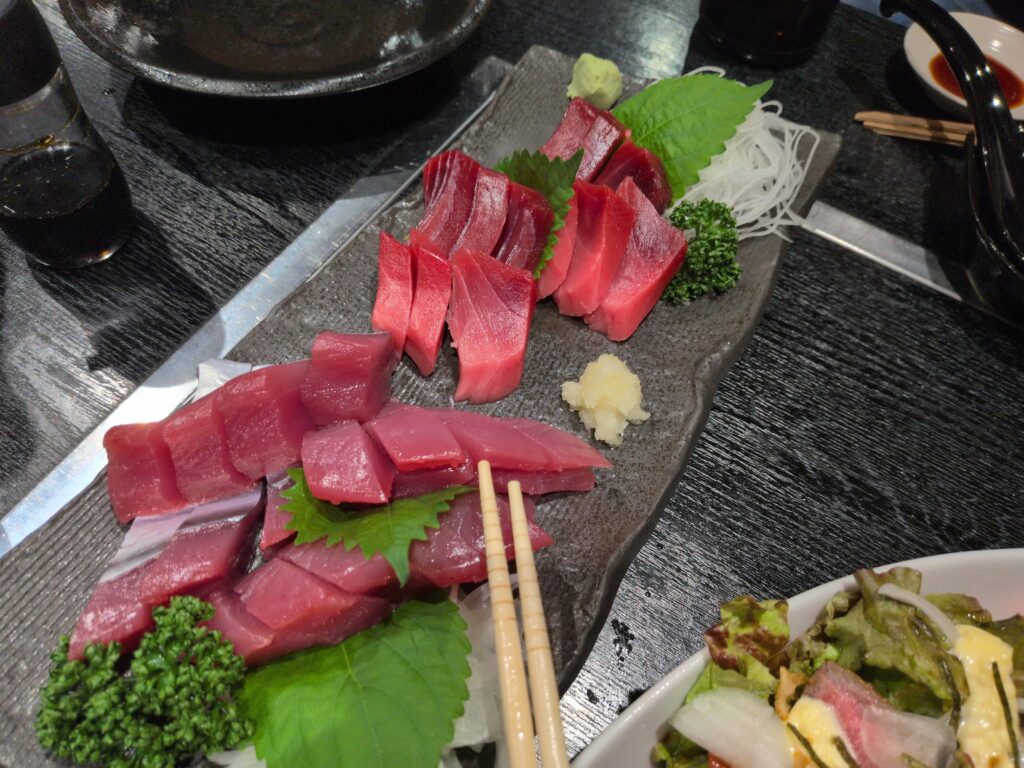写真のお刺身は手前がカツオ、奥がマグロとなっていまして、カツオは皮のあるものと無いものの2種類ご用意して頂きました。