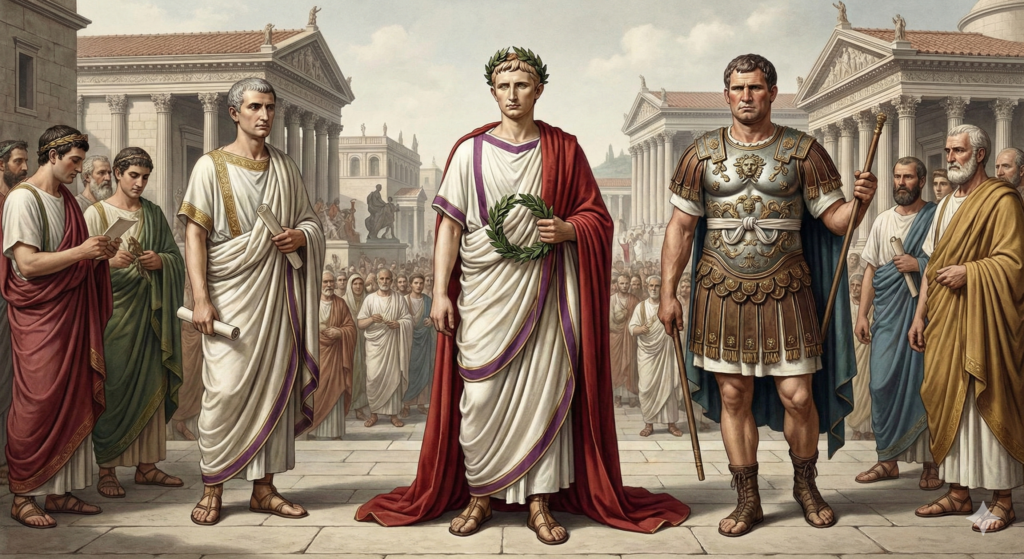 本当はオクタヴィアヌスという名前で、アウグストゥスというのは「偉大な者」とか「尊敬される人」とか、そういった類の尊称なのですが、こちらの方が短いし通りも良いのでアウグストゥスで通します。